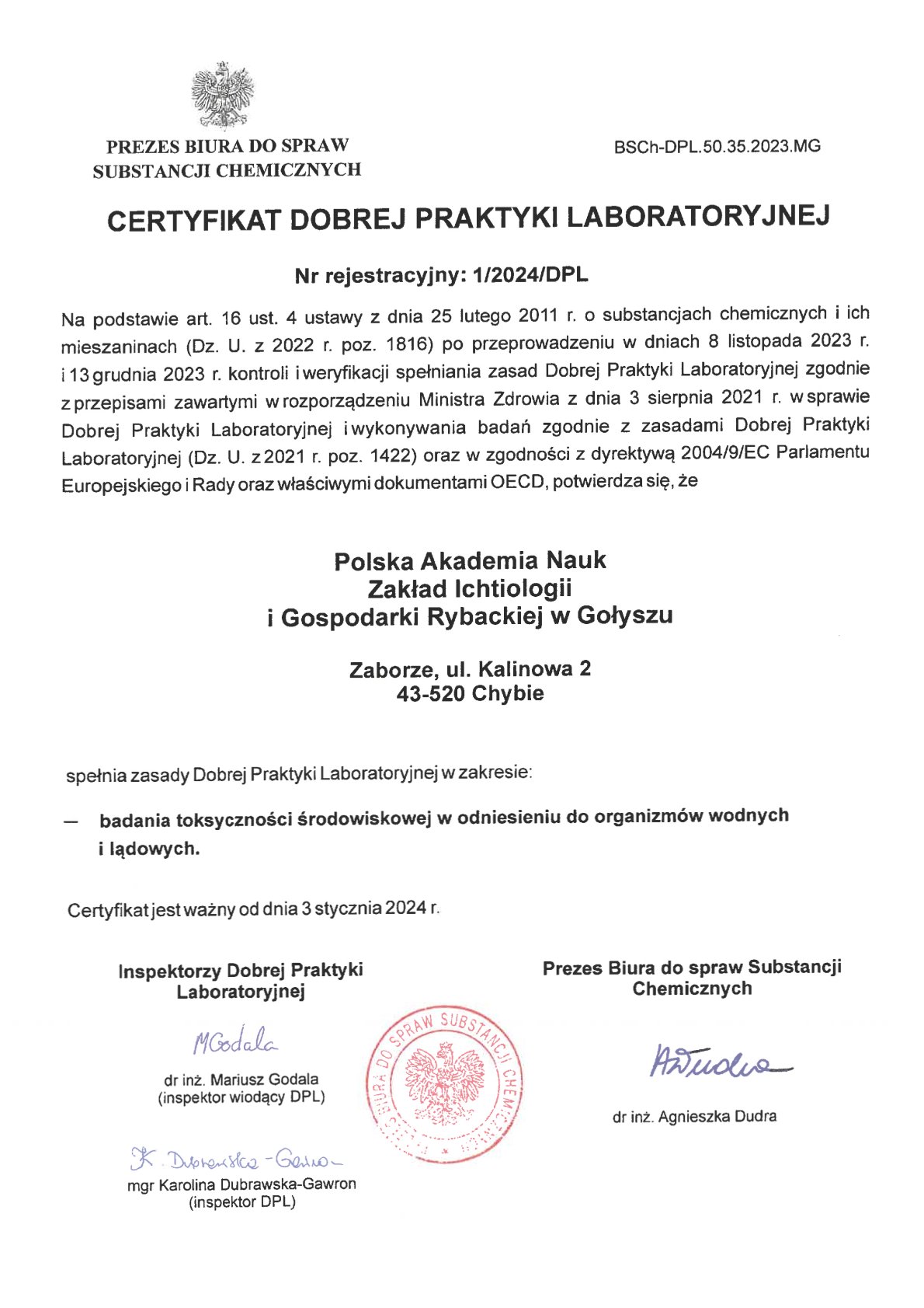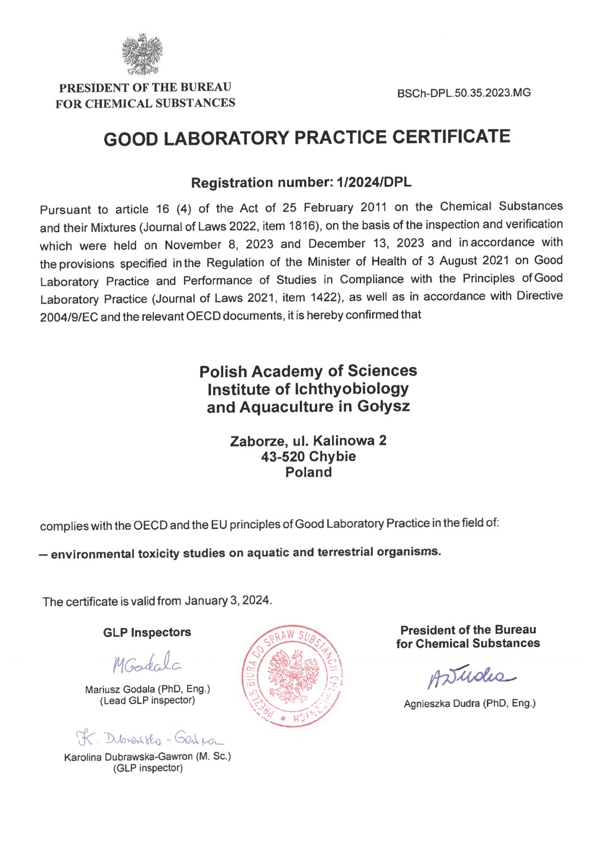 W 2024 Zakład uzyskał certyfikat Dobrej Praktyki Laboratoryjnej (DPL) w zakresie badań toksyczności środowiskowej w odniesieniu do organizmów wodnych i lądowych. ​Otrzymanie certyfikatu jest potwierdzeniem pozytywnie zakończonej kontroli przeprowadzonej przez Inspektorów Biura ds. Substancji Chemicznych i zgodności działania naszego laboratorium z zasadami Dobrej Praktyki Laboratoryjnej oraz stanowi gwarancję wiarygodności uzyskiwanych wyników badań.